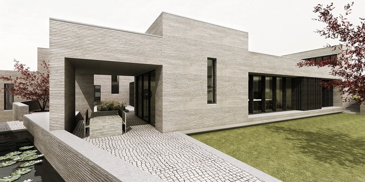 A rural house to retreat to, sited within apple orchards and organised on the axis created by the avenues of trees on the hillside with views across to the Malvern Hills. The house sits within a wildflower meadow and is perceived as a sequence of volumes linked by perimeter walls. The forms appear to emerge from the fields which grow wild all the way up the boundary – the domestic landscape contained inside the perimeter wall creating a clear hierarchy between house and farmland.